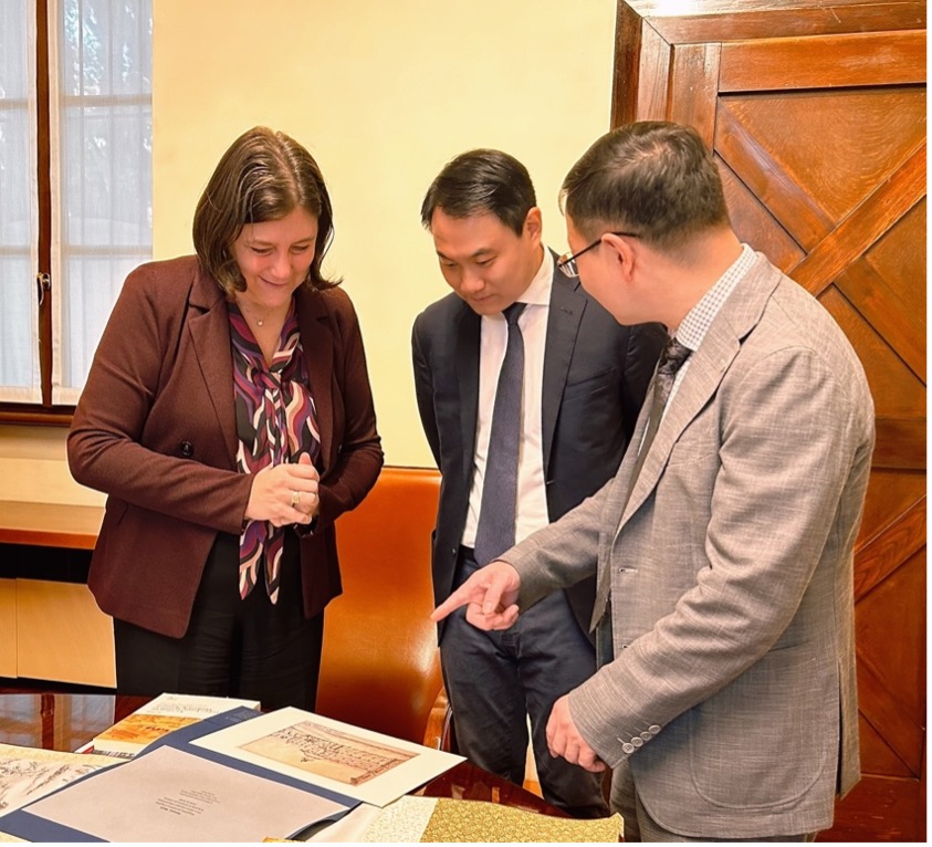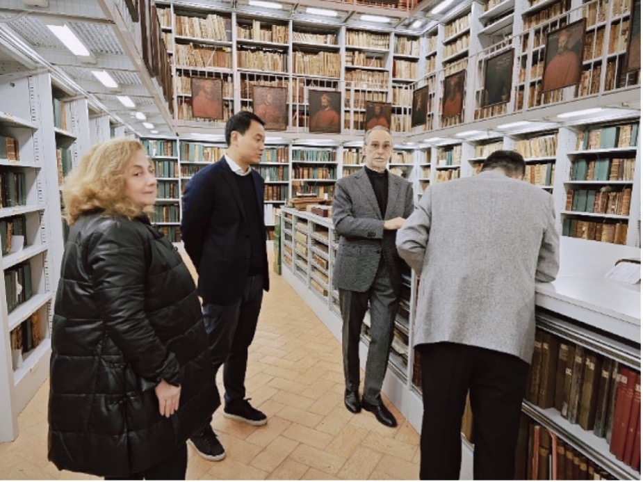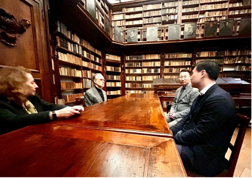 11月5日,代表团参观了米兰安布罗修图书馆,对于馆藏文献有了整体的了解。随后,代表团拜访了意中友协主席玛莉亚·罗萨·阿佐丽娜,双方就中意高校间人文合作及协会所藏文献整理研究进行了充分探讨。