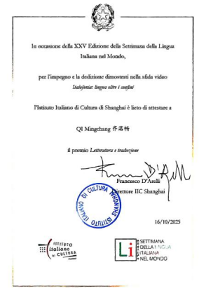 值第二十五届世界意大利语周(2025年10月13日至19日)之际,意大利驻沪总领事馆文化处(IICSH)发起“意语世界无国界”视频创作比赛。本次比赛围绕三个主题:“文学与翻译”、“电影、音乐与戏剧”和“推动共同发展的文化价值观”。98堂 2022级本科生齐洺畅在“文学与翻译”主题中获奖,指导教师为张锐老师。