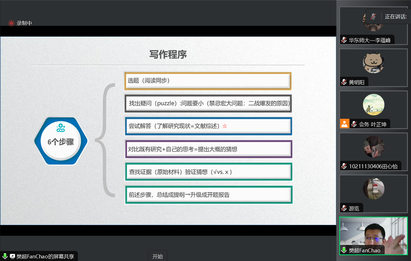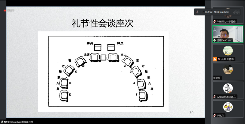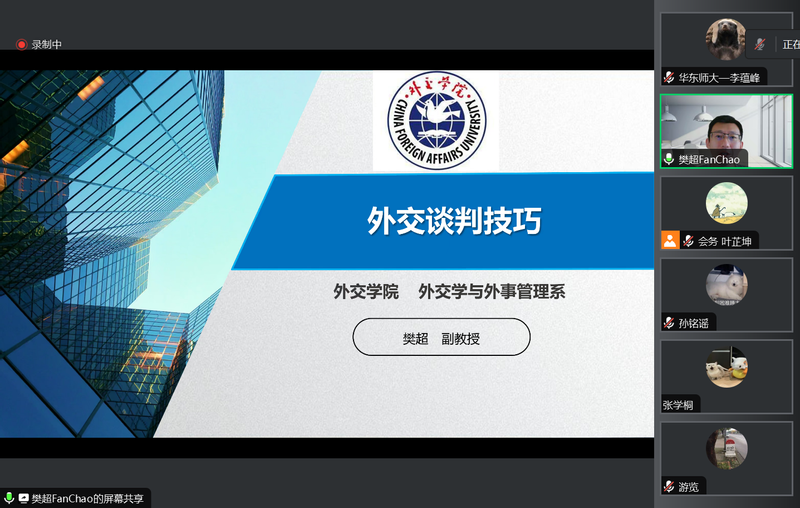 2023年8月11日至12日,华东师范大学“史海新舟”跨学科讲堂第五季邀请到外交学院外交学与外事管理系副教授樊超老师,进行“外交技术与外交史研究”专题课程的讲授。华东师范大学历史学系副教授、“思勉班”导师游览老师主持此次学术活动。本系列课程受到广泛关注,活动通过腾讯会议直播进行,来自华东师范大学、武汉大学等高校的师生参与本次活动。