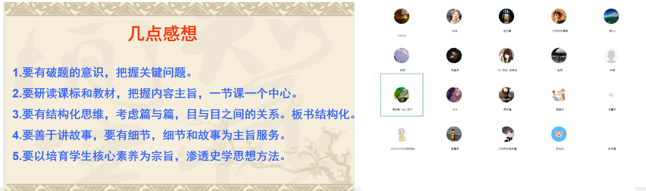 ● 万分感恩,受益匪浅。中学教师需要进一步关注学术前沿,关注更多的历史细节,将历史课堂的趣味性、知识性有效结合,兼具历史学的学术性,培养学生深度思考,提升学生史学思维。收获了一句话,“点线成面拉历史大势”。感谢各位老师的指导,学无止境,感恩相遇。谢谢叶同学的分享,切入点特别好,以人入史,受到了启发,学习了。感恩。