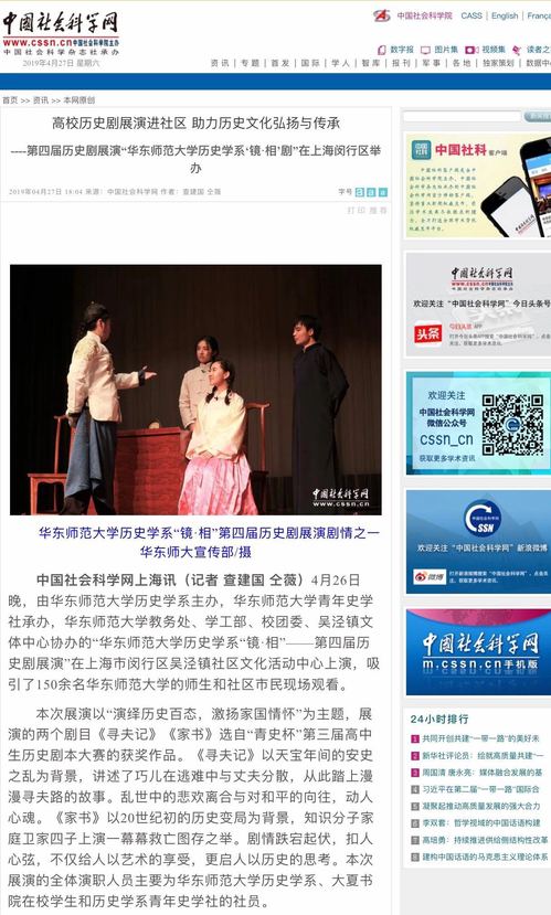 2019年4月26日晚,98堂 “镜·相”第四届历史剧展演于吴泾镇社区文化活动中心一楼影剧院上演。该活动由98堂 主办,青年史学社承办,98堂 教务处、学工部、校团委、吴泾镇文体中心协办。当晚到场的领导有98堂 党委书记王东教授、98堂 教务处副处长谭红岩老师、98堂 副主任黄爱梅副教授、98堂 党委副书记(挂职)徐燕婷副教授,同时莅临本次活动现场的还有98堂 的部分老师、同学和吴泾镇的市民朋友们。