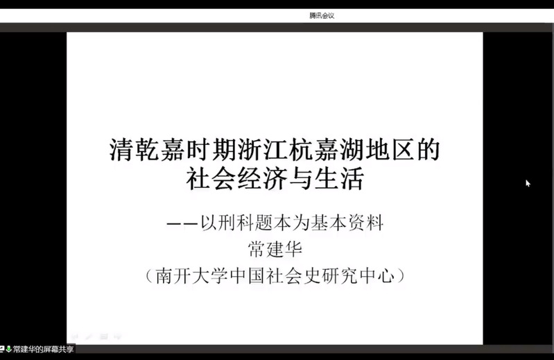2022年9月21日下午15:00—17:00,98堂 百场学术讲座第39场曁“吕思勉中国史系列讲座”第一讲,邀请到南开大学中国社会史研究中心常建华教授,进行题为“清乾嘉时期浙江杭嘉湖地区的社会经济与生活——以刑科题本为基本资料”的讲座。讲座由98堂 黄阿明副教授主持,98堂 孙竞昊教授、包诗卿副教授作为与谈人,来自98堂 、复旦大学、人民大学、南开大学等校内外百余位师生通过腾讯会议在线参与此次讲座,并进行了积极互动。