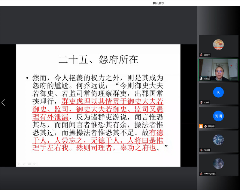 随后,陈时龙老师同线上听众展开互动,他对“明代推官是否为分权”“清代除废除推官后的刑名幕府”等问题进行了详细回答。交流氛围热烈,讲座圆满结束!