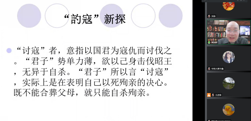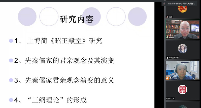 本场讲座主要围绕着先秦时期的君亲观念及其演变。黄国辉老师首先以上博简《昭王毁室》引入,重新释读“訋寇”。前人研究多将其释为“召寇”、“约寇”、“招寇”,其意相近,指欲招引盗贼或他国军队。黄老师认为“訋”字应读为“讨”,“訋”读音从“勺”,二者古音相近可通,“讨寇”者,击伐寇仇也。
