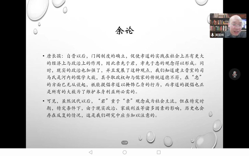 2022年10月13日晚上18:00,98堂 “百场校级学术讲座”第57场、98堂 “大夏中国史论坛前沿讲座”第3场,邀请到北京师范大学历史学院黄国辉教授,进行了题为“早期儒家君亲观念的演进与‘三纲理论’的形成”讲座。本场讲座的主持人为98堂 王进锋教授,数百人聆听了讲座。