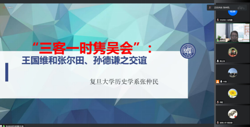 2022年11月9日,下午两点到四点,复旦大学历史系张仲民教授应邀做《“三客一时隽吴会”——王国维和张尔田、孙德谦之交谊》讲座,此为98堂 2022年百场校级讲座之第66场和2022年98堂 “大夏中国史论坛”前沿讲座之第五场。讲座由98堂 阮清华教授主持,为了更多听众受益,讲座采用线上方式进行,来自全国各地众多高校和科研院所的100多名师生收看和参与了讲座。