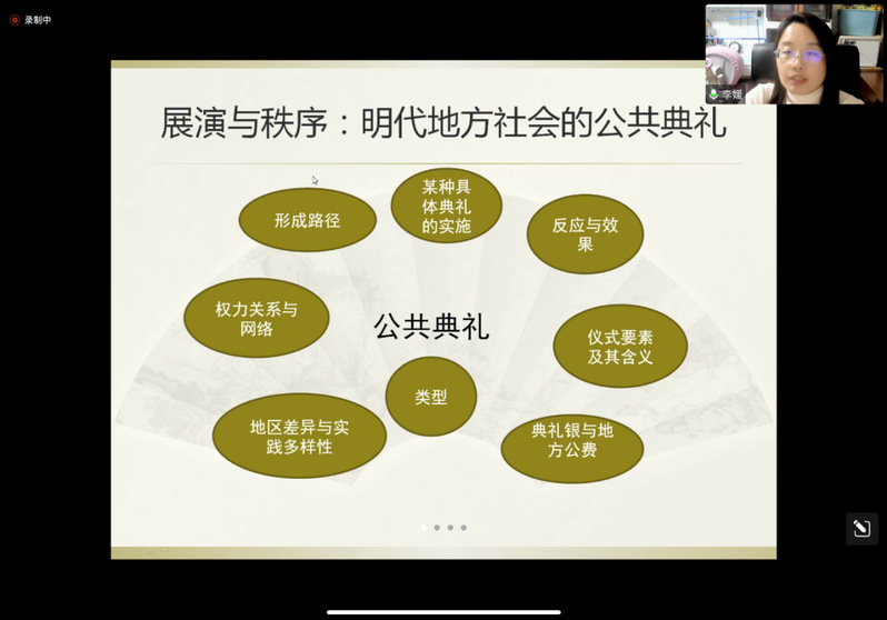 2022年11月16日下午15:00—17:30,98堂 大夏中国史论坛青年学者讲座2022年第2场,邀请到东北师范大学亚洲文明院副教授李媛老师进行题为“展演与秩序:明代地方社会的公共典礼”的讲座。98堂 副教授包诗卿老师主持此次活动,98堂 副教授董佳贝老师、黄阿明老师作为与谈人,来自98堂 、中国人民大学、南开大学等高校众多师生通过腾讯会议线上参与,部分98堂 历史系同学齐聚线下,双渠道结合参加此次讲座。