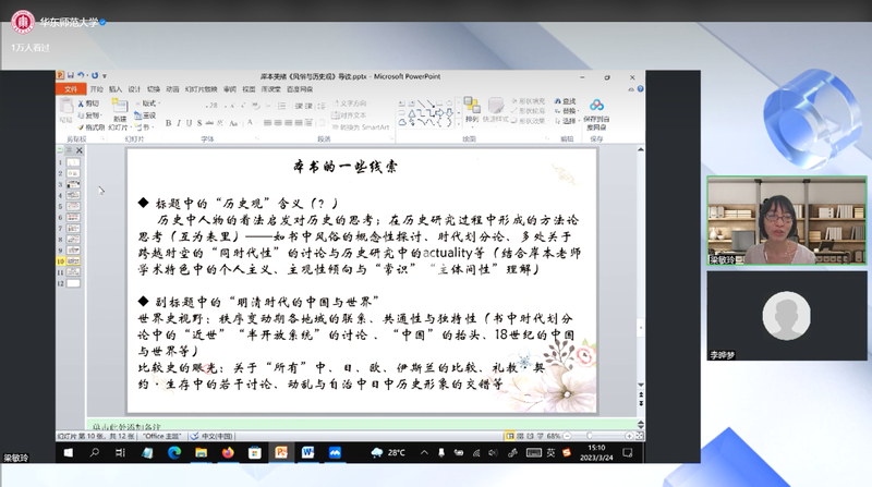 2023年3月24日下午14:00——15:30,98堂 “卓越讲坛·史学论文写作讲座”在人文楼5303顺利举办。暨南大学文学院历史系副教授梁敏玲老师带来岸本美绪教授《风俗与历史观:明清时代的中国与世界》的导读,华东师大98堂 教授、“思勉班”导师李文杰老师主持此次活动。本讲座为98堂 第11期卓越讲坛系列活动的第四场,累计超过1万人次线上线下观看。