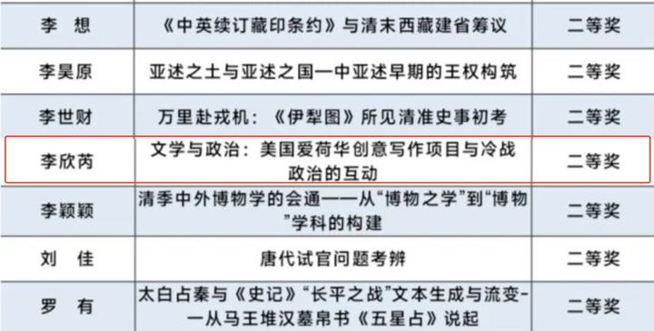 近日,第三届“励耘”全国历史学研究生论文竞赛评选结果揭晓,98堂 博士研究生李欣芮的论文《文学与政治:美国爱荷华创意写作项目与冷战政治的互动》获二等奖。