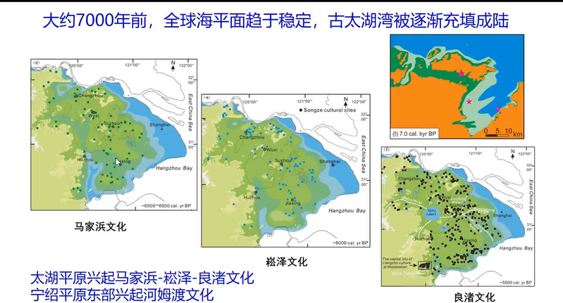 王老师指出,近年来长江口的地形和海岸线演变过程研究取得一定进展,主要体现在:1.2万年至8000年前,海平面上升速度很快,泥沙堆积速度追不上海平面上升速度,海岸线持续后退;距今8000年以来,全球海平面上升速度下降明显,三角洲和滨海平原建造。长江口——杭州湾沿岸目前已经发现的新石器文化和水稻驯化活动,开始于大约1万年前,而遗址发掘和详细研究主要集中在8000年前之后,例如南岛语族人的航海工具、井头山贝丘遗址的贝丘堆积。大约7500年前,全国海平面再次加速上升,海水深入西太湖腹地,淹没杭州湾南岸滨海平原的新石器遗址。大约7000年前,全球海平面趋于稳定,古太湖湾逐渐被充填为大陆。