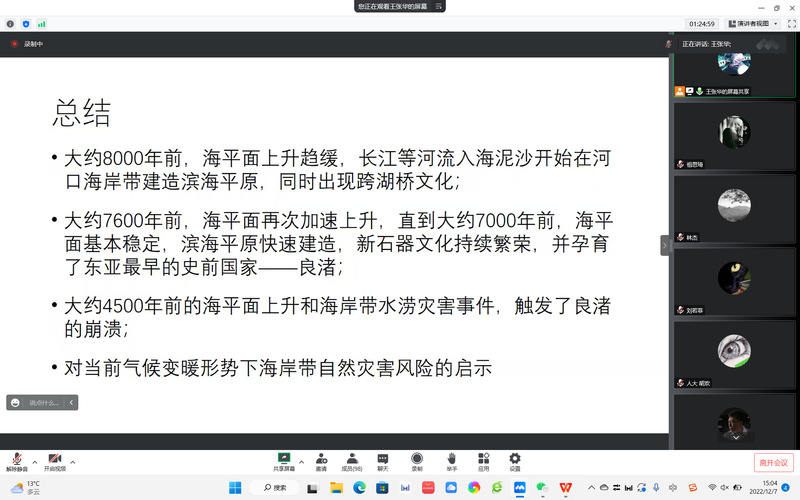 最后,王老师总结分析了气候环境变化与人类社会的互动关系,例如跨湖桥文化的出现得益于河流入海泥沙建造的滨海平原、东亚最早的史前国家良渚的出现和崩溃都与海平面的变化息息相关等,强调注重环境保护和关注海岸带生态环境的重要现实意义。