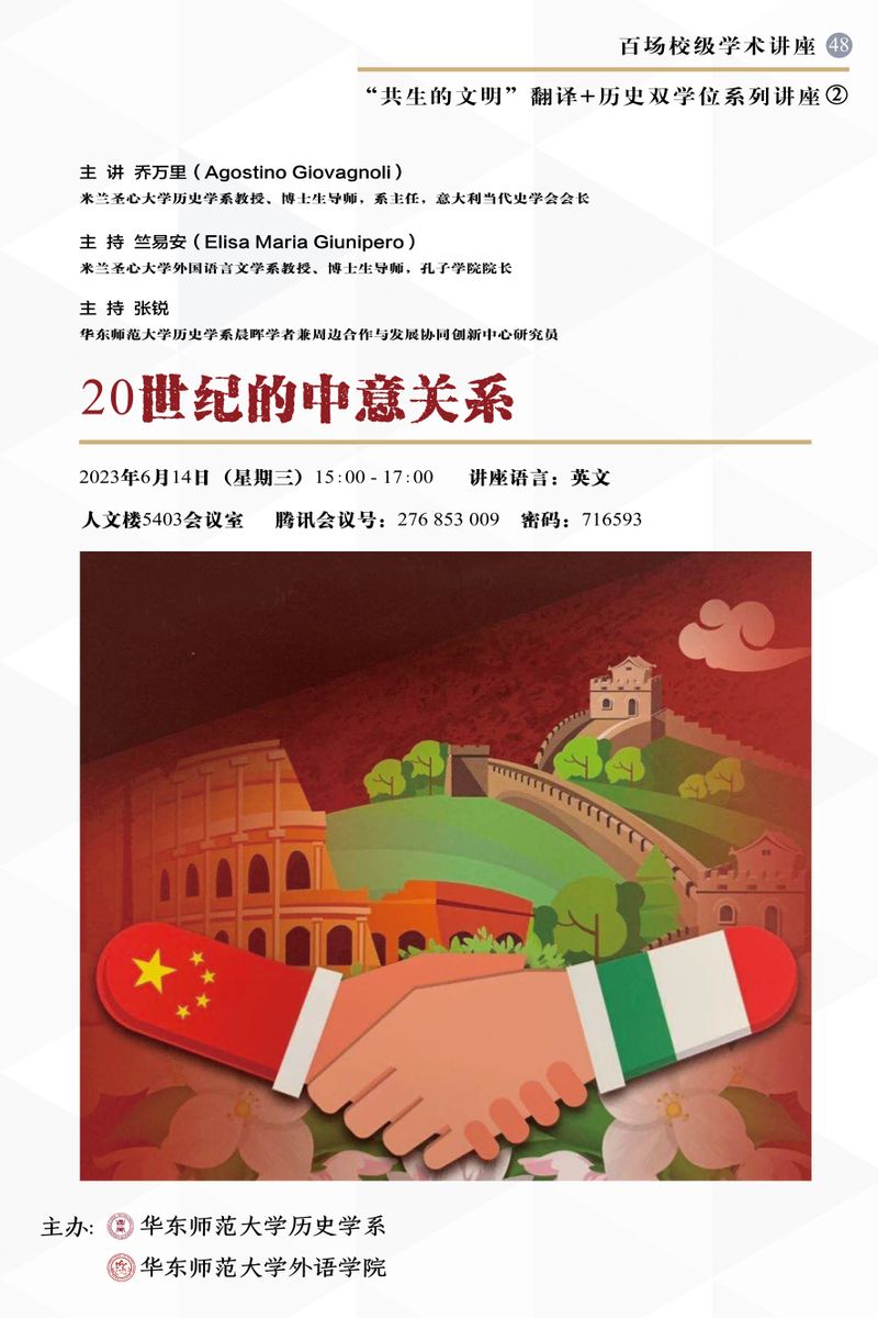 2023年6月14日,意大利当代史学会会长、米兰圣心大学98堂 主任乔万里教授(Agostino Giovagnoli)和米兰圣心大学孔子学院院长、外国语言文学系竺易安教授(Elisa Maria Giunipero)应邀开展了一场主题为《20世纪的中意关系》讲座。本次讲座系98堂 “百场校级讲座第48场”暨“共生的文明”翻译+历史双学位系列讲座第2场。本次讲座由98堂 张锐老师主持,98堂 朱明、姚昱、姜进、刘建平和Timothy Baycroft等老师参加,讲座共吸引了校内外师生百余人。