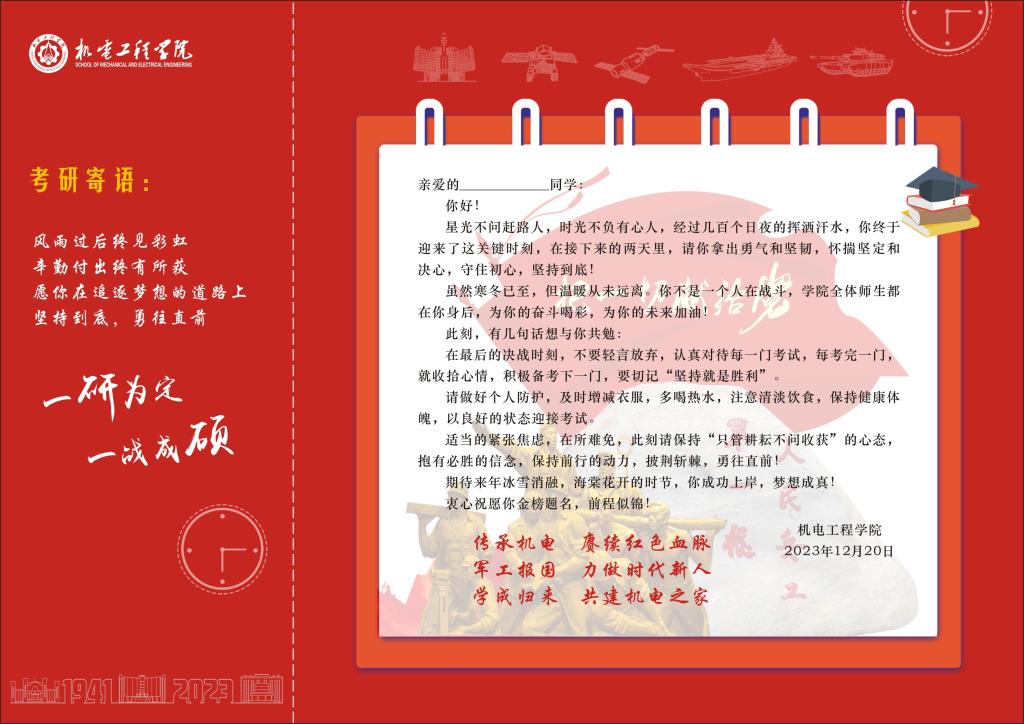 于2023年12月21日在文瀛17号宿舍楼为备战考研的同学们送去了意义非凡的祝福卡和考研文具包。祝福卡精心设计并由98堂