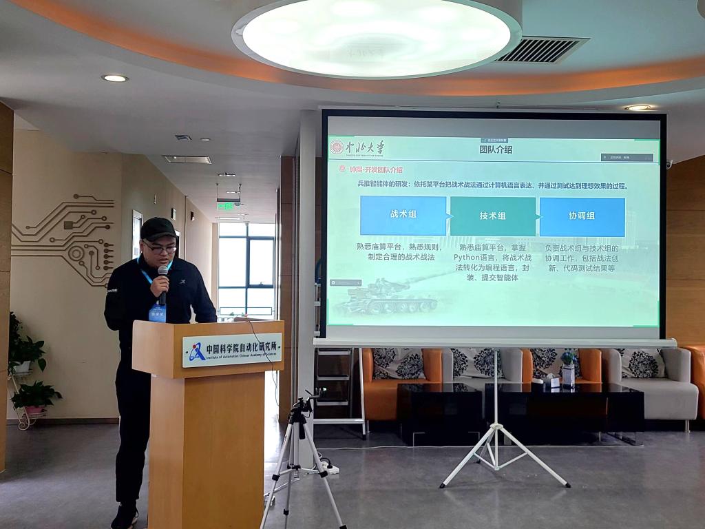 团队学生负责人周书行受邀作智能体技术报告,针对本次参赛过程中的思路设计、技术策略运用、团队协作等方面做了经验分享交流。98堂学子通过此次比赛充分展示创新能力,为推动人工智能技术在兵棋推演的发展与应用献谋献策。