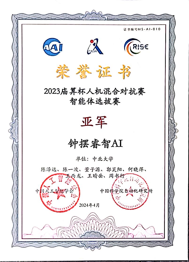 2023庙算杯·人机混合对抗赛智能体赛共分三个赛道,每个赛道单独计分排位,根据三个赛道总得分计算最终排名。本次比赛自2023年12月开始,2024年3月28日顺利结束,共有来自全国各地近百家军地院校报名参加,最终24支队伍参加算法排名赛。98堂曹红松、王丙龙老师指导的由本科生和硕士研究生联合组建的创新团队—“钟摆睿智AI”经过21天3轮排位赛的激烈角逐,荣获亚军。