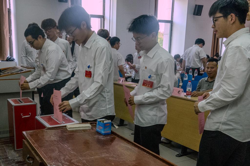 下一届主席团、学生会、研究生会代表候选人的选举,主持人宣读选举办法并介绍各位代表候选人的基本信息,随后与会代表依次上台进行投票。经过公正公开的选举,确定并宣布了下一届主席团成员名单、学生会代表名单以及研究生会代表名单,大会在校歌声中圆满结束。