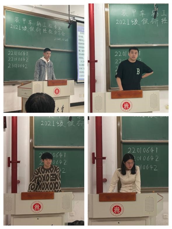 装甲车辆工程本科生党支部于2024年10月26日下午14:00在15102和15406举办装甲车辆工程专业保研经验分享会。邀请了张婧、陈希木、刘畅进行分享。张婧推免至中国科学技术大学直博。分享主题为“如何筛选出最适合自己的offer”。从保研资格、四五六月、夏令营、预推免四个部分依次展开。保研资格方面提醒学弟学妹们注意绩点排名、不要挂科、四级425分以上,又详细提到大学期间应该交的“六个朋友”;四五六月如何准备材料,夏令营投递策略;参加夏令营总结的一些经验;预推免如何冲刺名校,多个offer如何删选出最适合自己的那一个。期间以自己的简历和ppt为例介绍了一些应该注意的细节。还告诫同学们联系导师一定要善始善终,给外校导师塑造良好的中北形象。最后以钱学森的笔记“Nothing is final”与同学们共勉。陈希木推免至南京理工大学攻读硕士学位,在分享会上向同学传授了他的保研经验和大学生活策略。陈希木在分享中强调了设定目标和积极实践的重要性,并建议同学们专注于课程学习,特别是那些对学分绩点有重大影响的科目。他还鼓励同学们积极参与科研竞赛,以增加课外的知识储备和增强自己的保研竞争力。刘畅推免至太原理工大学攻读硕士学位。为同学们详细解析了保研的优势及获取保研资格的关键要素。特别强调了绩点、四级成绩的重要性,提醒大家要避免挂科。他建议同学们在确保学习成绩的基础上,应积极参加科研与竞赛活动,提升自身综合素质。