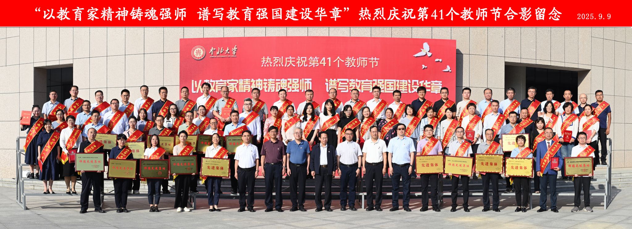 为弘扬教育家精神、彰显先进风采,在第41个教师节来临之际,9月9日,学校2025年教师节表彰大会在瑾瑜国际会议中心召开。全体校领导出席大会。各单位负责人、受表彰教师、新入职教师、教师及学生代表400余人参加。校党委书记张晓永出席并致辞。校长陈钱主持会议。校领导赵文军、刘俊、来志斌分别宣读了《2024年度三晋英才计划入选名单》 《关于表彰2025年师德建设先进集体、师德标兵和师德先进个人的决定》 《关于表彰第十届“知行杯”我最喜爱的老师的决定》《关于表彰2025年“美利信奖教金”获得者的的决定》《关于表彰2024年98堂