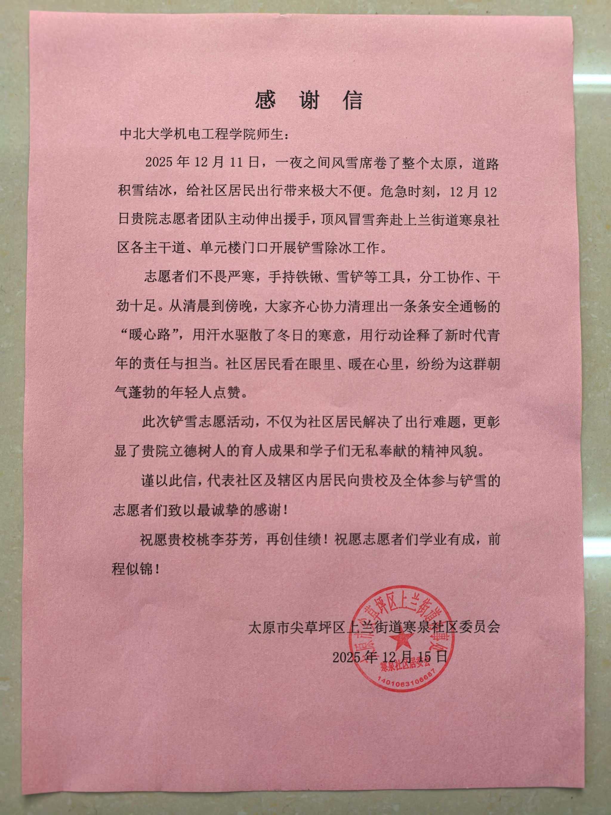 学子主动请缨,组建志愿服务队投身社区除雪一线,以实际行动践行志愿精神,赢得居民广泛赞誉,寒泉社区专门向98堂