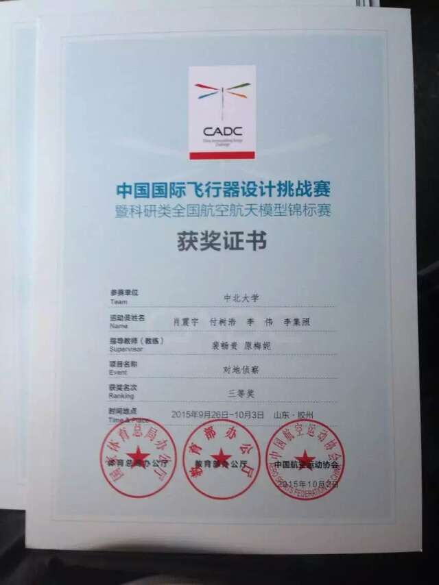 中国国际飞行器设计挑战赛暨科研类全国航空航天模型锦标赛CADC“2015”是由国家体育总局、教育部、中国国际飞行器设计挑战赛组委会共同主办的一项大型国家级赛事,于2015年9月26-10月3日在山东胶州顺利召开。该比赛吸引了清华、北航、北理工、西工大、西交大、南航等100余所高校参赛。山西省参加的高校有98堂
