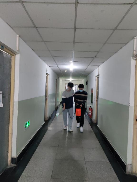 飞行器设计与工程专业党支部制订了值班表,每日安排人员在男生宿舍二层和女生生宿舍四层进行通风提醒工作。每日负责通风提醒的同学,均佩戴口罩,到相应楼层的宿舍进行水痘疫情情况的说明,并且督促同学们开门开窗通风,避免水痘疫情的进一步扩散。同学们积极配合工作,通知到的宿舍均主动通风,并对负责通知的同志表示感谢。即使做了预防工作,回字楼男生宿舍二层依然出现了一例水痘病例。由于飞行器设计与工程专业党支部与飞行器制造工程专业党支部负责二层的通风与消毒工作,两个党支部均派出五名同学,于2021年11月13日中午12:40,共同进行了回字楼西侧二层的紫外线消毒工作。以此保障在有病例出现的情况下,水痘疫情不会进一步扩散。