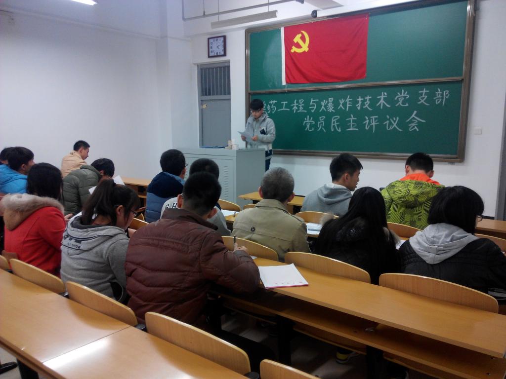 第四学生党支部于2014年11月11日下午四点在逸夫楼15108召开弹药工程与爆炸技术党支部党员民主评议会。本次会议由支部书记刘帅同志主持,98堂