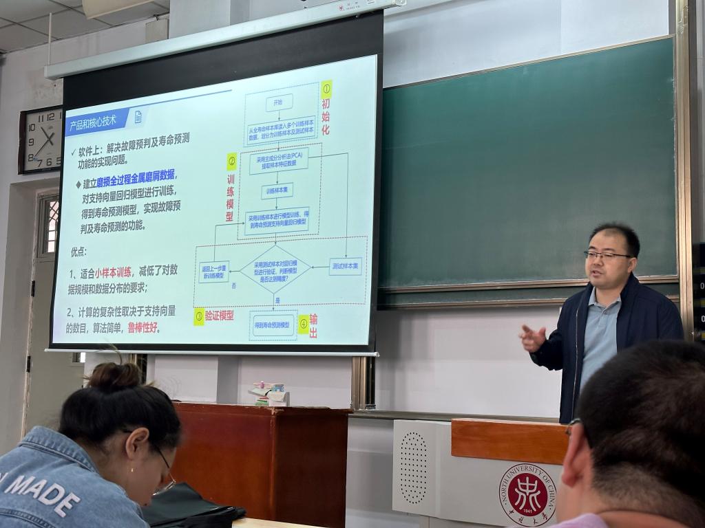 钱教授从齿轮箱故障检测常见方法、磨损全过程金属磨削数据库建立、检测过程信号处理以及该技术在行业的应用做了深入浅出的讲解,并与在场研究生进行学术互动。
