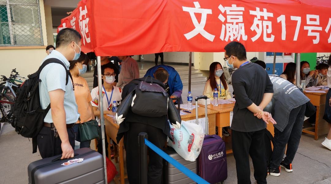 报到点。新生只需提供录取通知书、刷身份证,便可方便快捷地完成入学手续。在宿舍楼下,新生们在工作人员的引导下有序排队领取学校一卡通、住宿证以及宿舍钥匙。在新生报到过程中,迎新工作人员始终以饱满的热情招待新生及家长,帮助新生搬运行李,介绍学校基本情况,尽职尽责。