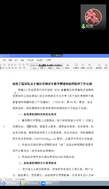 《关于做好暑期学生教育管理和疫情防控工作的通知》([2020年] 第19号)要求。随后,他强调:一、加强暑假期间思想政治教育,暑假期间开展线上主题班会,每个班级要至少召开2 次线上主题班会,主题包括:爱国主义教育、理想信念教育、生命教育、社会责任教育、感恩教育和军工文化教育等;二、加强暑假期间安全管理教育,做好“日报告”、“零报告”制度,做好本班学生成绩统计分析,做细做实特殊群体学生帮扶工作,做好家校联系联动;三、加强暑假期间心理健康教育, 充分了解学生心理健康状况,追踪重点关注学生,开展心理健康教育主题班会。之后,刘书记就假期学生疫情防控工作提出十点要求,并强调,本着以人为本的原则,强化底线思维,放假与疫情期间,教育不断线,关注每一位学生的成长与发展。